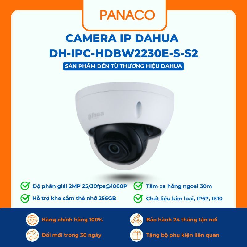 Panaco cung cấp camera Dahua chính hãng, bao gồm mẫu DH-IPC-HDBW2230E-S-S2 với giá tốt, bảo hành đầy đủ và hỗ trợ kỹ thuật trọn đời. Quý khách cần báo giá nhanh – Zalo 0989 352 251 để được chiết khấu hấp dẫn.