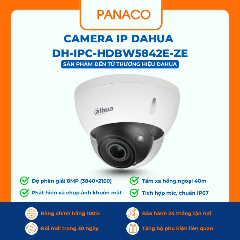 Nếu bạn đang tìm nơi mua camera Dahua DH-IPC-HDBW5842E-ZE chính hãng với giá tốt, thì Panaco chính là địa chỉ đáng tin cậy để bạn lựa chọn. Là đơn vị chuyên phân phối và lắp đặt thiết bị an ninh, Panaco cam kết cung cấp sản phẩm Dahua chính hãng 100%, đầy đủ tem nhãn, CO/CQ và bảo hành theo đúng tiêu chuẩn của hãng.