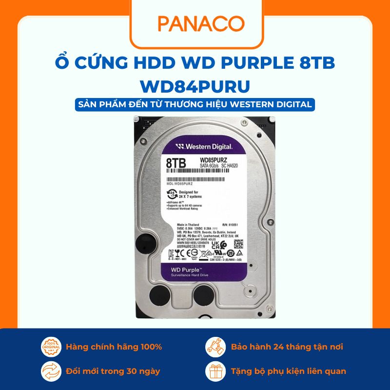 Hiện nay, Panaco đang phân phối ổ cứng HDD WD Purple 8TB WD84PURU với mức giá … VNĐ, phù hợp cho những khách hàng đang tìm kiếm giải pháp lưu trữ dung lượng lớn, ổn định và chuyên dụng cho hệ thống camera giám sát. Với mức đầu tư hợp lý so với dung lượng 8TB và độ bền được tối ưu cho vận hành liên tục 24/7, đây là lựa chọn đáng cân nhắc cho gia đình, cửa hàng, văn phòng cũng như các công trình giám sát quy mô lớn. Sản phẩm được đảm bảo chính hãng, mới 100%, giúp người dùng yên tâm sử dụng lâu dài và tối ưu chi phí đầu tư cho hệ thống lưu trữ.