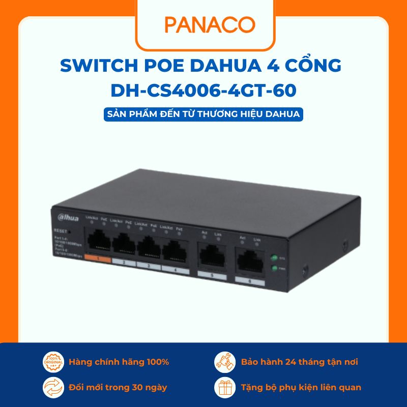 Panaco phân phối Switch PoE Cloud Dahua DH-CS4006-4GT-60 chính hãng, bảo hành chính hãng, giá bán minh bạch. Anh em cần tư vấn chọn switch, báo giá tốt hoặc hỗ trợ lắp đặt camera miễn phí, vui lòng liên hệ Zalo/Hotline 0989 352 251 để được Panaco hỗ trợ nhanh và tận tâm.